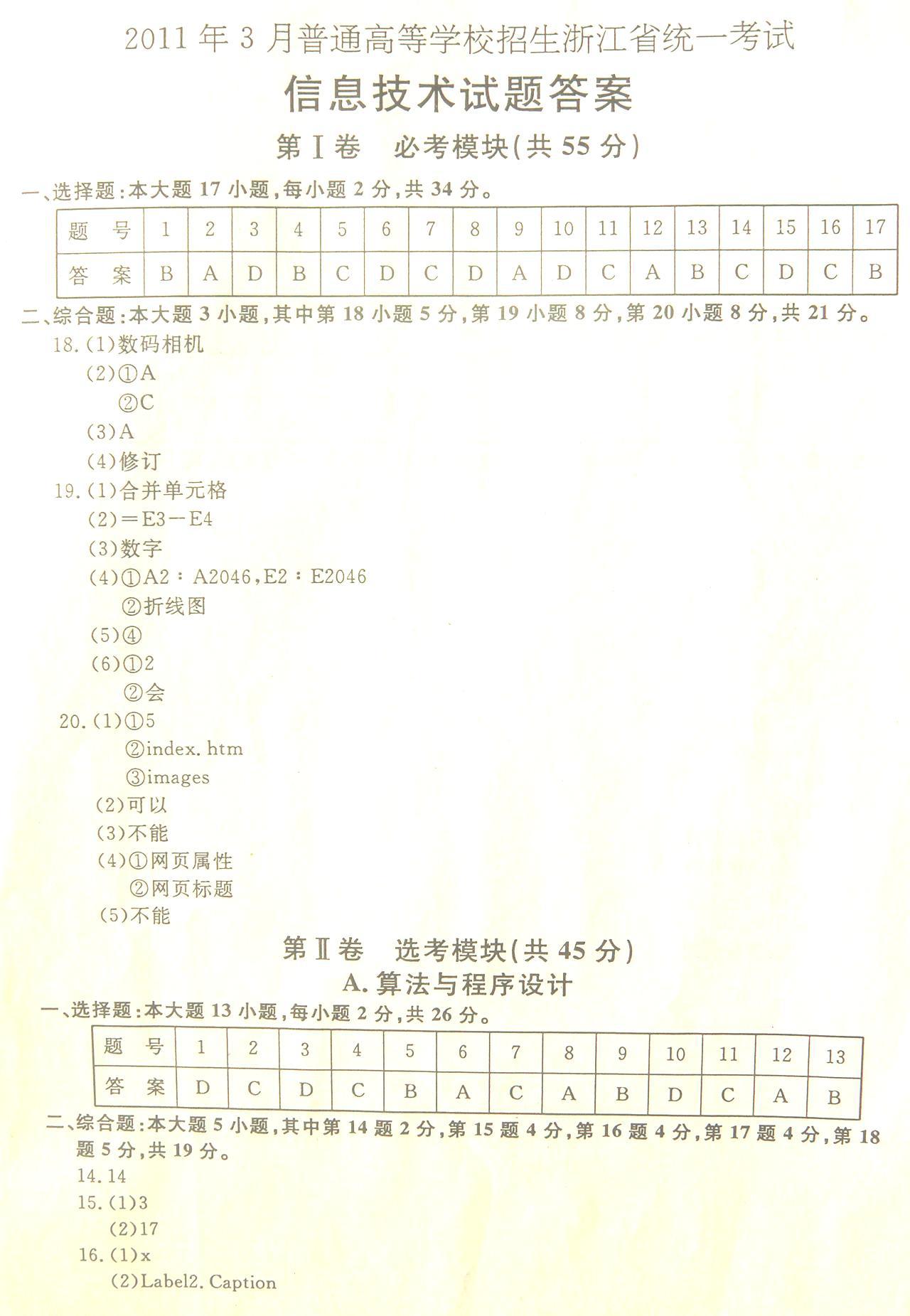 2011年3月普通高等学校招生浙江省统一考试信息技术试题答案