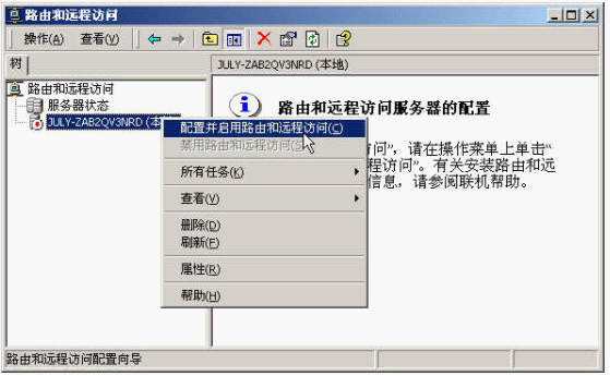 1、在Windows 2000 Server上,从管理工具中进入"路由和远程访问"(Routing and Remote Access)服务,在服务器上鼠标右击,-》"配置并启用路由和远程访问"