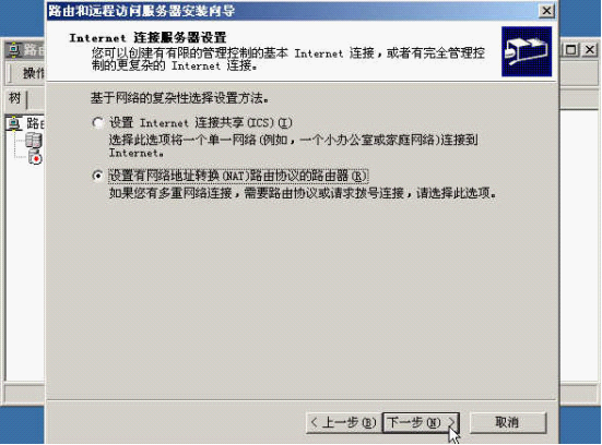4、选"设置有网络地址转换(NAT)路由协议的路由器",不要选"设置Internet连接共享(ICS)".(ICS与NAT的区别在于使用的容易程度上,为了启用ICS,只需要选择一个复选框就可以了,而为了启用NAT,则需要更多的配置任务,此外,ICS用于小型网络上的原因还在于:针对内部主机,它需要有一个固定的IP地址范围;针对与外部网络的通信,它被限制在单个公共IP地址上;它只允许单个内部网络接口。)