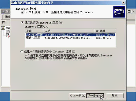 6、在"路由和远程访问服务器安装向导"中选"Internet连接"(就是连向Internet的那个连接),点"下一步"。