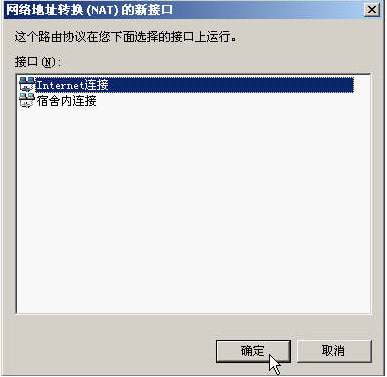 5、在"网络地址转换(NAT)的新接口"中选择"Internet连接"(也就是连向Internet的那个连接,可不要选错咯)