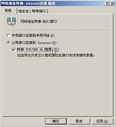 6、在"网络地址转换-Internet连接属性"中选中"公用接口连接到Internet",复选"转换TCP/UDP头(推荐)"