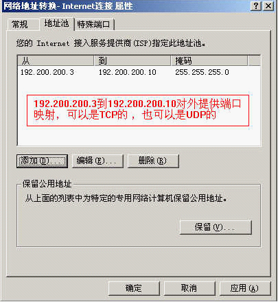 9、"添加特殊端口",这里就是设置端口映射的核心了,把NAT主机的哪个端口映射到内网主机的哪个端口就在这里设置,由于设有"地址池",所以可以在"公网地址"中添上"地址池"中的任一地址,这里添的是"192.200.200.3",也就