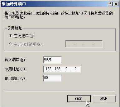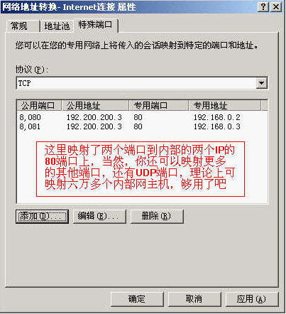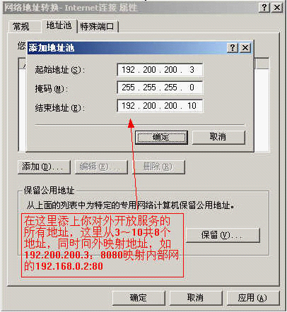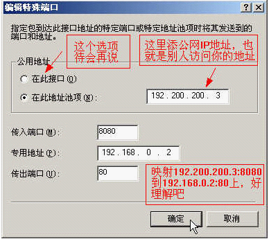 "专用地址和传出地址"就是内部主机的IP地址和提供特殊服务的端口,这里是把192.200.200.3上的8080端口映射到192.168.0.2上的80端口。