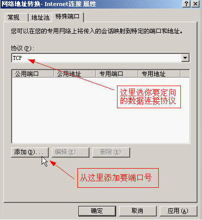 8、在"特殊端口"选项表里提供了你需要定向的数据连接协议(是TCP还是UDP协议,如Web和FTP就是TCP协议的),选准后"添加"