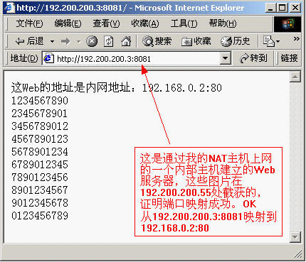 在192.200.200.55出测试了一下NAT主机上的Web服务器和内网中192.168.0.2上建的Web服务器,得出结果如下:(不好意思,中间改过一下端口号,192.200.200.3上的8081端口映射到192.168.0.2的80端口)