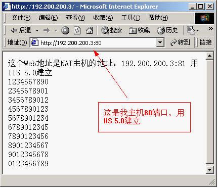 这台NAT主机上开通了IIS 5.0,端口是80,用端口映射的办法把8081端口映射到内部主机192.168.0.2的80端口上。