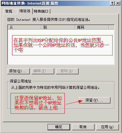 也就是你只有一个公网IP地址,这比较适合只有一个IP的朋友,可以不用"地址池",何必做多余的设置呢?假如有问题的话,还不是自找麻烦。